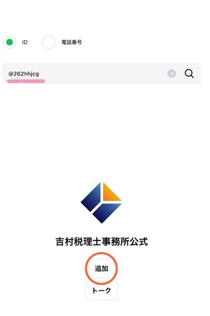 ③LINEの検索窓で、「@262hhjcg」を検索して「追加」をクリックする。